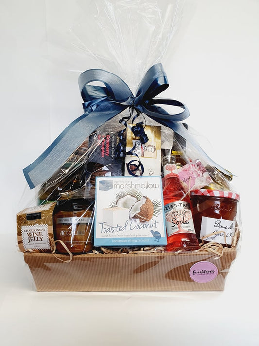 • New to our Menu is this snackers delight gift box, packed with delicious nibbles to share with your friends and family. A great picnic pack or pre BBQ platter. Gift Box includes - Proper Crisps Garden Medley Chips, Barkers Sundried Tomato and Olive Chutney, Wafers, Cheese Straws, Semi Dried Apricots, Almonds, Black Cherry and Pinot Noir Jelly, Waitemata Cheese and a pack of Fererro Rochers. Order for your same day hamper and gift box delivery to Papamoa, Mount Maunganui and Tauranga