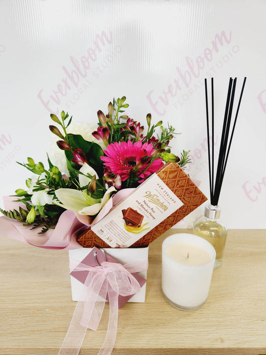 • Floral Candle and Chocolate Gift Box - Everbloom Floral Studio. Sending flowers across Tauranga, Papamoa and Mount Maunganui same day