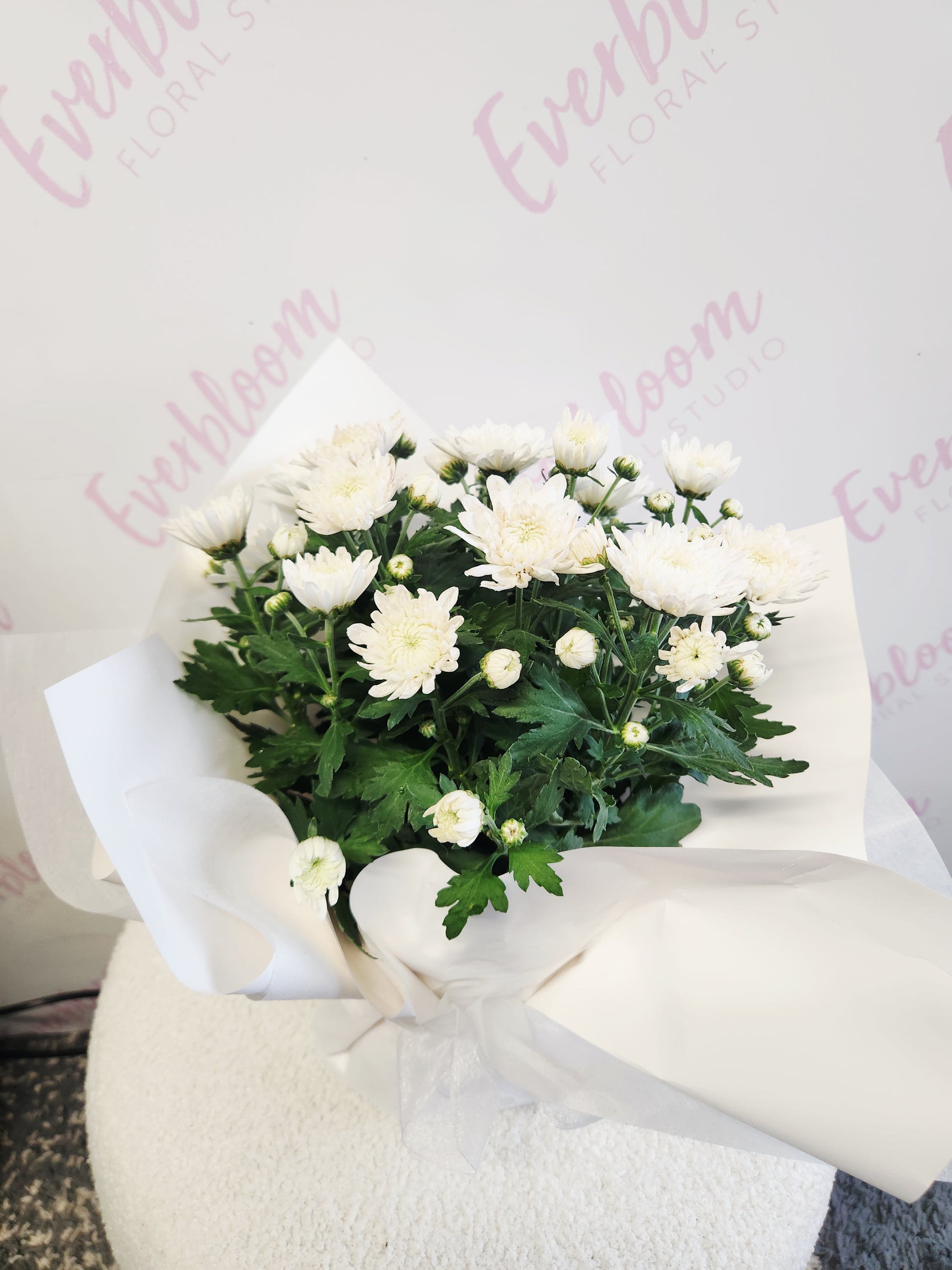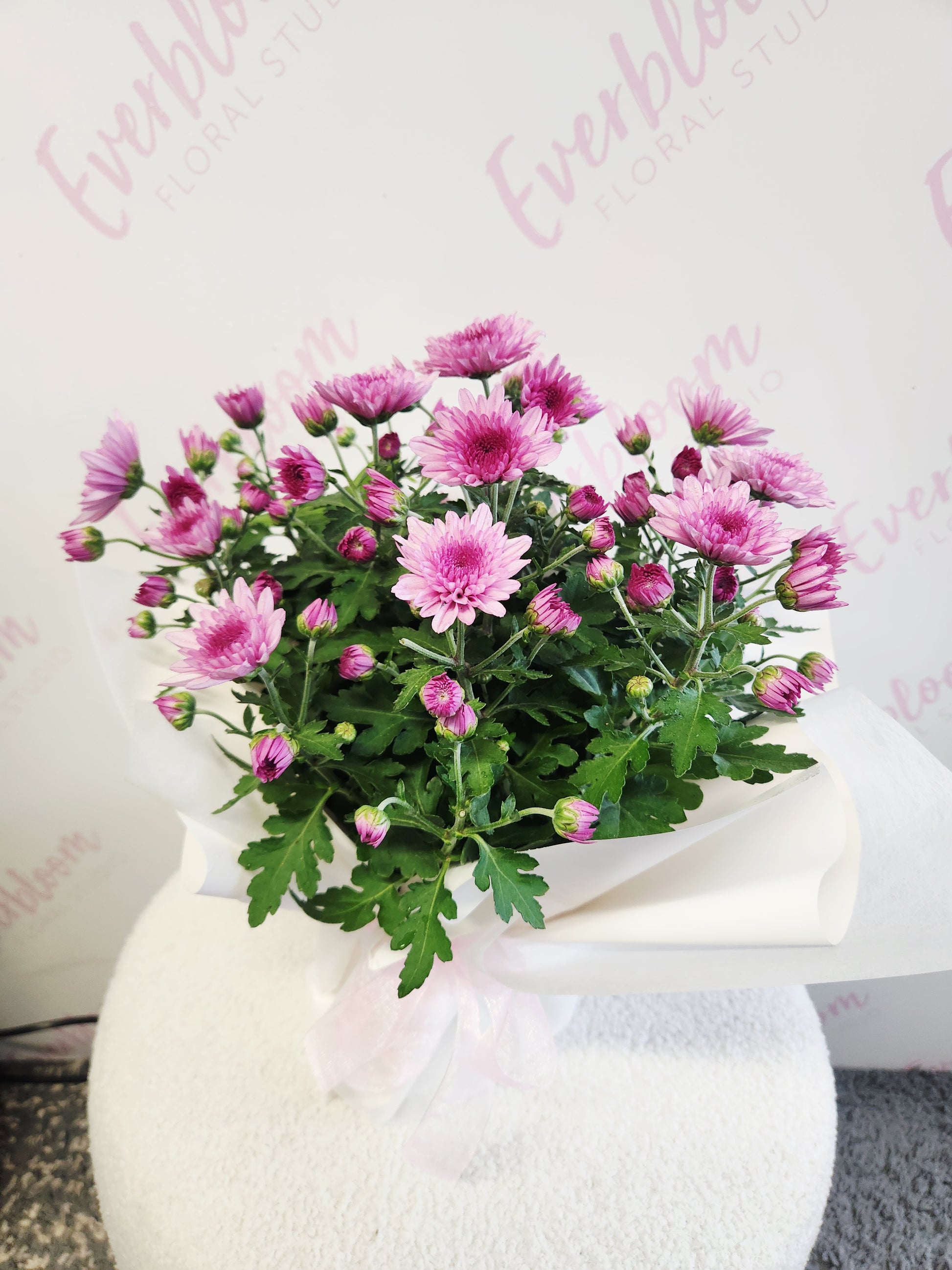 Chrysanthemum plants in a variety of colours wrapped and packaged in a gift bag with a bow. Colours vary due to availability.